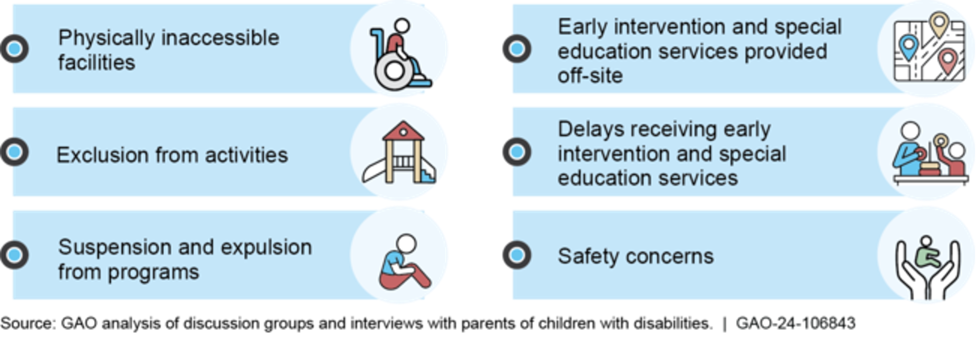 Families of children with disabilities and parents with disabilities—including physical, intellectual, and developmental disabilities—reported various barriers to finding and using child care programs, which affected their family's well-being. For example, when searching for child care, parents could not easily find information about programs that could serve children with disabilities. Parents with disabilities reported difficulties communicating with their child care provider and instances in which they faced exclusion or disparaging comments from staff or other parents. Parents' difficulties finding and maintaining appropriate child care resulted in some reducing their work hours, leaving their jobs, or moving their families to new locations.