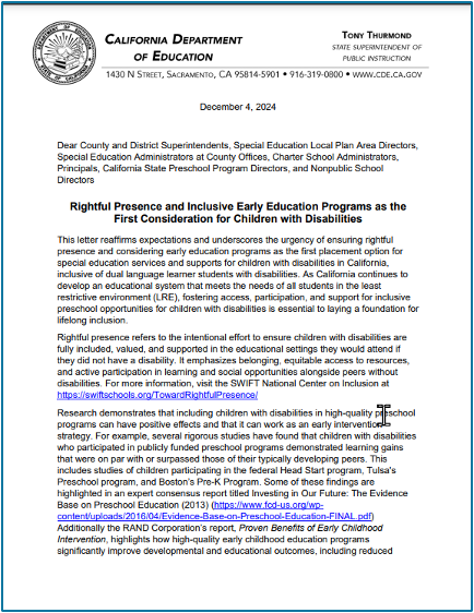“This letter reaffirms expectations and underscores the urgency of ensuring rightful presence and considering early education programs as the first placement option for special education services and supports for children with disabilities in California, inclusive of dual language learner students with disabilities. As California continues to develop an educational system that meets the needs of all students in the least restrictive environment (LRE), fostering access, participation, and support for inclusive preschool opportunities for children with disabilities is essential to laying a foundation for lifelong inclusion. Rightful presence refers to the intentional effort to ensure children with disabilities are fully included, valued, and supported in the educational settings they would attend if they did not have a disability. It emphasizes belonging, equitable access to resources, and active participation in learning and social opportunities alongside peers without disabilities.”